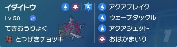 技は最大火力の「ウェーブタックル」、耐久がギリギリのため反動ダメージのない「アクアブレイク」、先制技の「アクアジェット」、水耐性の相手に打つ「おはかまいり」