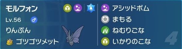 今作で多くの毒タイプが覚えるようになった「アシッドボム」は虫毒タイプのモルフォンも習得しており、それを使ってモルフォンの「アシッドボム」+隣のポケモンの特殊技で相手の低速構築のポケモンを倒すことを目的としています