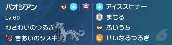 サイコフィールドを消滅させられて命中も100の「アイススピナー」、詰め性能を高めるために必須の「ふいうち」、相手のパオジアンを倒すための「せいなるつるぎ」、ターン稼ぎのための「まもる」